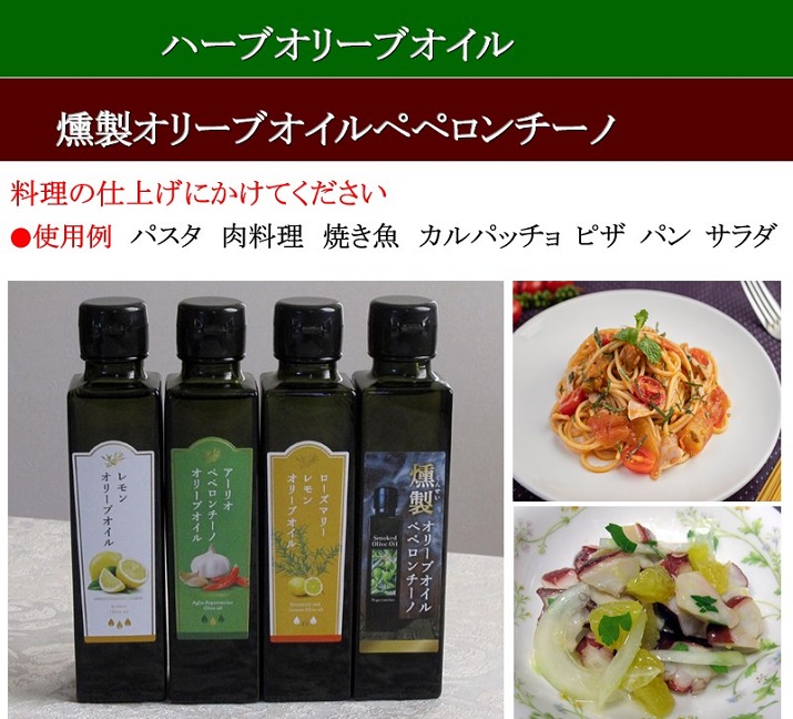 ハーブオリーブオイル・燻製オリーブオイルペペロンチーノ (各 ¥1380 税込み)